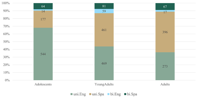 - Adolescents favour English in unilingual mode more strongly than the other age groups, indicating a generational shift, led especially by women.
